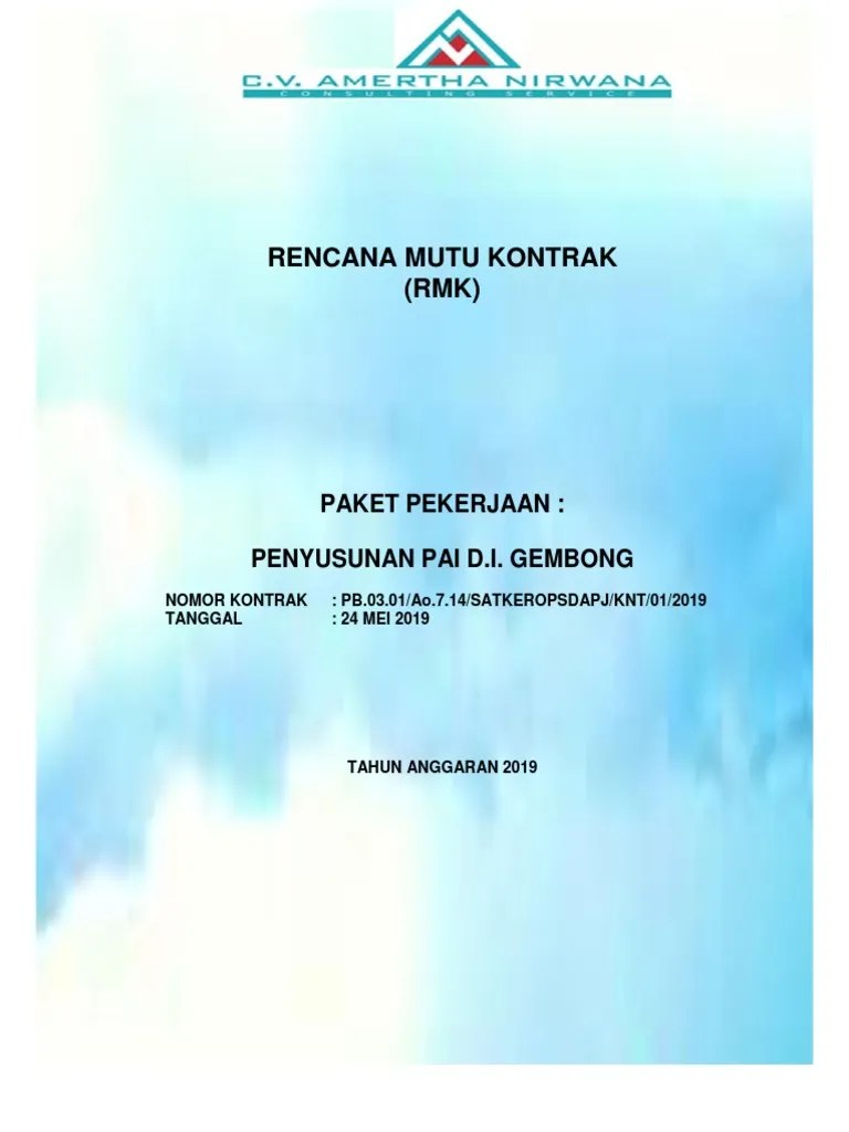 Laporan rencana mutu kontrak (rmk) meliputi penjelasan tentang semua kegiatan. Dari analisa perbandingan yang dilakukan pada rencana mutu. Rencana mutu kontrak ini adalah merupakan suatu persyaratan untuk pencapaian spesifikasi. Rencana mutu kontrak ini merupakan cara pengendalian proses mutu untuk pekerjaan . Kerangka acuan kerja (kak) rencana mutu kontrak desain partisipatif r/u di.